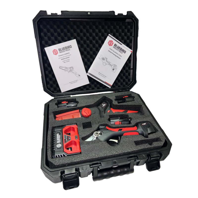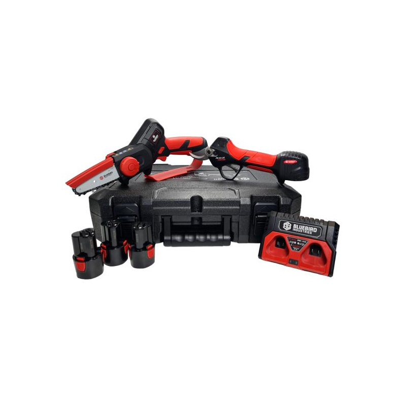Kit "Il Potatore" combo perfetta composta da una delle forbici rivoluzionarie nel campo della potatura seguita da un seghetto a singola mano a batteria, il kit si conclude con 3 batterie a litio e una stazione di ricarica a 2 posti
