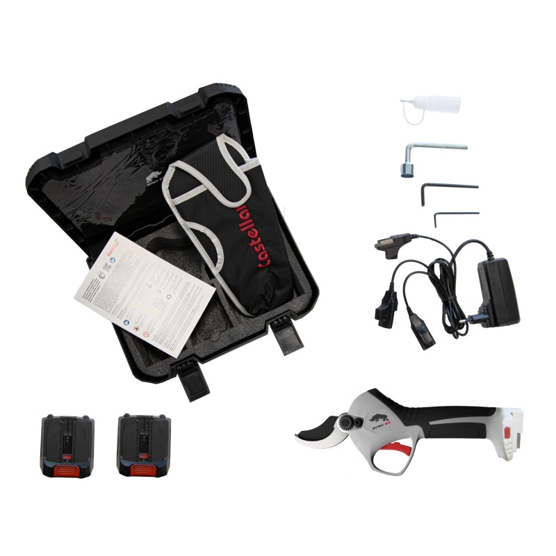Ogni forbice . dotata di due batterie*, carica batterie, fodero, chiavi per lo smontaggio.
